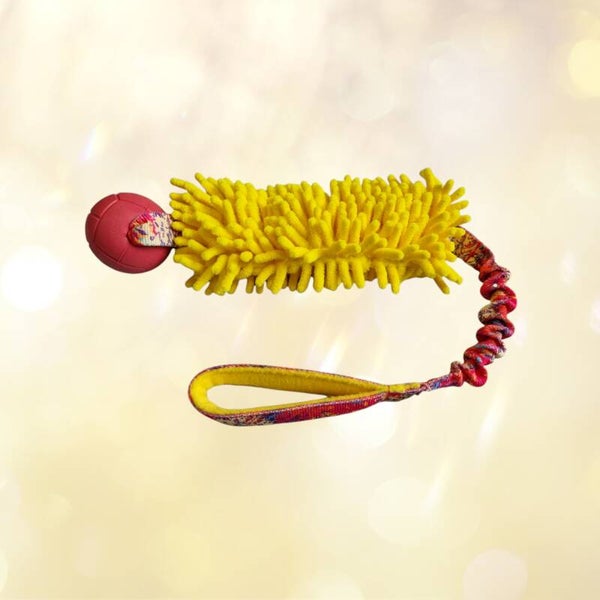 Dog toy with soft ball, bite pad made of colored Microfiber. Lined handle with elastic part. Overall length: 58 cm.